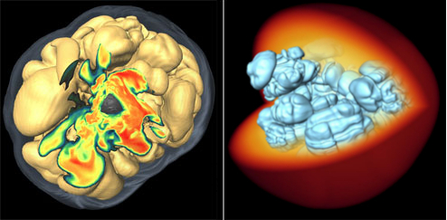 The MPA Supernovae group is a world-leader in modelling the violent deaths of stars in the form of supernovae and studying how such explosions produce the chemical elements, generate gravitational waves or can be used as reliable cosmic distance indicators. Massive stars end their lives in core collapse supernovae when the star has run out of nuclear fuel in the interior. In some cases the explosion following the initial collapse can lead to particularly energetic hypernovae or gamma-ray bursts. Another type of supernovae occurs in binary systems involving white dwarfs, the compact remnants of less massive stars. These thermonuclear supernovae explosion can either be triggered by accretion of material from a companion star or during the merger of two white dwarfs. The MPA group specializes in performing realistic multi-dimensional hydrodynamical supercomputer simulations of the different types of supernovae and gamma-ray bursts, which takes into account detailed microphysics such as turbulent flame propagation, neutrino transfer, magnetic fields and special and general relativistic effects. The supernova models are also used to predict the emergent spectrum to compare with observations.