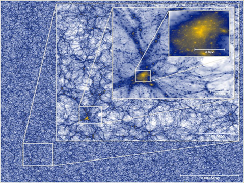 - The morphology, quantitative characterisation and observational measurement of the large scale structure in the galaxy, dark matter and intergalactic gas distributions.